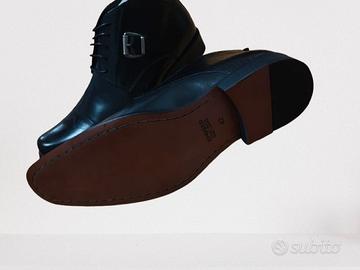 Scarpe in pelle nera sono perfette per cerimonie, eventi formali o anche per un look business sofisticato. Modello a metà tra stringata e stivaletto, con elegante fibbia laterale e punta squadrata dal design moderno.