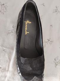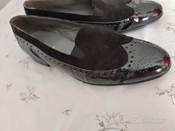 queste scarpe sono in vera pelle verniciata nero è camoscio con suola in cuoio con un tacco di circa 2 cm. prodotto di alta qualità manufatturiera.