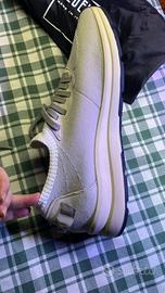 Paio di scarpe nuove di color grigio chiaro e bianco, sneakers calzino, in maglia elasticizzata di pura lana, morbida e traspirante, arricchita da eleganti riporti in pelle scamosciata molto eleganti, di Fedeli, taglia 43, mai usate, con il loro cartellino e la loro borsa in tela. L'interno, completamente foderato, include una soletta in pelle naturale estraibile che assicura una calzata ottimale e personalizzabile. Sono perfette per un look casual chic o per outfit sportivi con un tocco di lusso