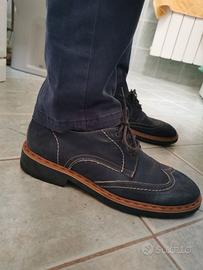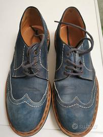 Le scarpe Old Signature sono un modello brogue/derby con un design che unisce eleganza classica e un tocco moderno. Presentano una tomaia in pelle nabuk di colore blu navy, con cuciture bianche a contrasto che ne esaltano i dettagli. La suola è spessa e chiara (marrone/caramello), contribuendo a un look robusto e distintivo e promettendo comfort e buona aderenza. Sono versatili, adatte sia a look casual-chic che più ricercati.