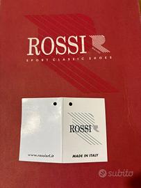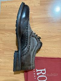 Si tratta di un paio di scarpe made in Italy prodotte dal calzaturificio Rossi, taglia 42 brogue (o francesine/derby decorate) in pelle con una finitura effetto invecchiato o abrasivato, che conferisce loro un aspetto vintage. Sono caratterizzate da: