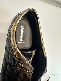 Collezione Baldinini, genere sportivo in pelle stampata coccodrillo, finiture in tinta oro. Fondo in gomma con logo, complete di scatola. Numero 43