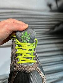 Sneakers uomo Brain Tropy mande in Toscany Italy, realizzate in tessuto metallo e pitone tinto grigio (vero pitone), fondo gomma con logo, ricamo logo verde fluo e laccetti gialli. Taglia 42. completo di sacca in tela (articolo venduto dall'azienda in origine in sacca e non in scatola).