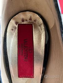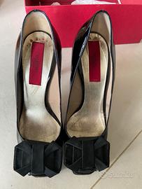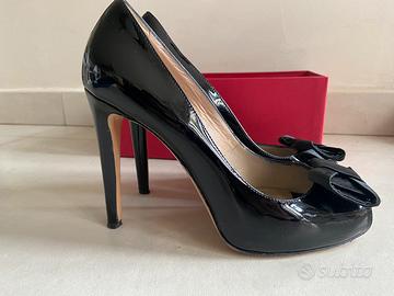 Vendo causa inutilizzo scarpe Valentino come in foto nero lucido con fiocco, tacco 11,5 cm plateau 0,9 cm. Taglia 39. Utilizzate 1 sola volta per matrimonio. Vendo con scatola originale, coperchio parzialmente danneggiato.
