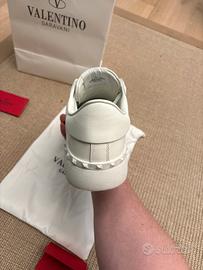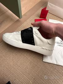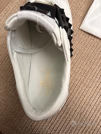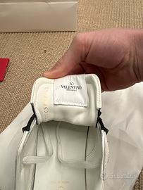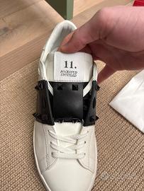 Colore principale: bianco, sia sulla tomaia che sulla suola. • Materiale: pelle liscia. • Lacci: bianchi, classici. • Dettaglio distintivo: una fascia in pelle nera che attraversa la linguetta, decorata con borchie piramidali nere (i classici Rockstud). • Etichetta sulla linguetta: bianca in tessuto, con la scritta "11. ROCKSTUD UNTITLED." • Stile generale: minimalista ma con un tocco luxury e "rock" tipico della linea Valentino Untitled.