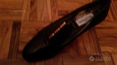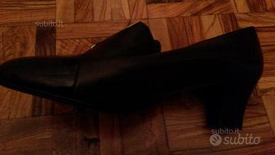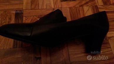 Scarpe tipo "decollete" marca Valleverde, modello classico da signore, colore testa di moro taglia 38,5 placchette colore oro come decorazione nella parte superiore molto comode, stondate (la punta è in vernice lucida)