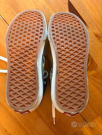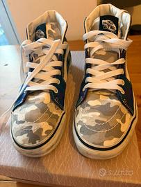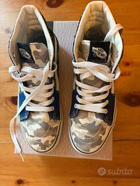 Vendo Vans Sk8-Hi (modello high-top) modello della collezione Mix & Match, caratterizzato da un design asimmetrico che unisce una stampa camouflage grigia sulla punta e sulla linguetta, un motivo tie-dye verde/nero sui lati e inserti mimetici blu/viola. Caratteristiche e Condizioni: • Marca: Vans "Off The Wall" • Modello: Sk8-Hi (Alte) • Taglia: 37 EU (US Juniors 5.5 / 23.5 cm) • Colore: Grigio Camo / Verde Tie-Dye / Blu / Bianco • Condizioni: Ottime. Come si vede dalle foto, la suola waffle è quasi intatta e l'interno è pulito. La tomaia in tela e pelle scamosciata non presenta strappi. • Dettagli: Lacci bianchi originali, classica banda laterale Vans bianca e logo rosso sul tallone. Spedisco velocemente.