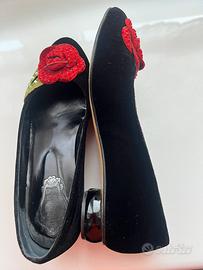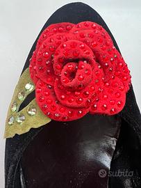 Scrape velluto neto taglia 40 per serate eleganti tacco insolito, fiore rosso con brillantini Belen Donate