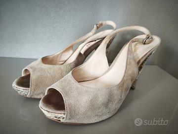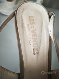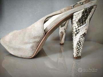 vera pelle scamosciata, tacco 10, plateau interno, vera gomma . taglia segnata 36.5, ma calzano perfettamente 37, avendo conghietto di regolazione. Made in Italy
