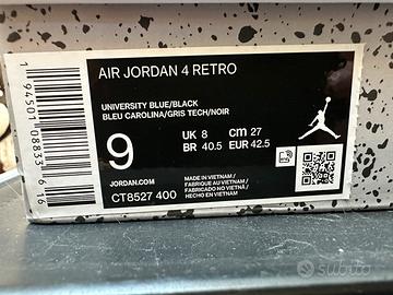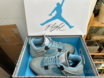 Jordan 4 university blue, utilizzate poche volte e tenute senza nessun tipo di danno. Presente anche la scatola originale. Prima della consegna saranno lavate e messe a nuovo.