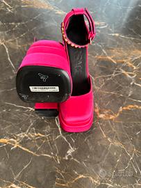 Vendo Versace Pumps Medusa in raso colore fucsia misura 35 rivestimento interno in pelle tomaia tessuto soletta pelle e suola in cuoio tacco 16 cm plateau 6 cm