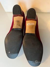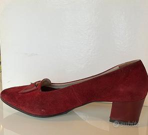 Modello elegante con tacco medio, realizzato in vera pelle scamosciata rossa, tipico dello stile italiano dell’epoca. Produzione artigianale, qualità manifatturiera oggi difficile da trovare.