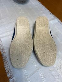 Scarpe Vintage Superga tela blu, punta in gomma color bianco panna, lacci panna. Comode e fresche, tipicamente primavera/estate/autunno. Modello basso. Soletta originale all'interno. Tela classica, tipo jeans, blu con punta, lacci e bordi panna.