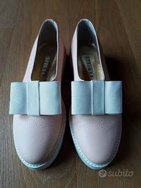 Il colore della pelle è rosa, la suola è in gomma, il fiocco è in tessuto bianco, la suola in vibram.