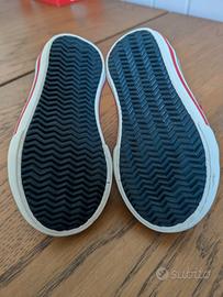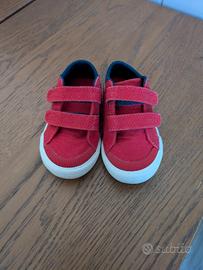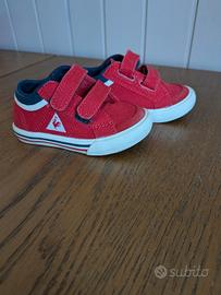 Vendo scarpine da bambino marca Le Coq Sportif, colore rosso, con chiusura a strappo doppio per una calzata facile e sicura. Suola in gomma antiscivolo.
