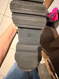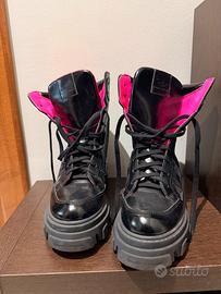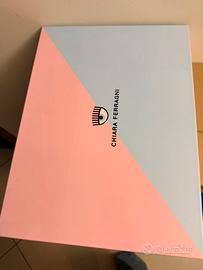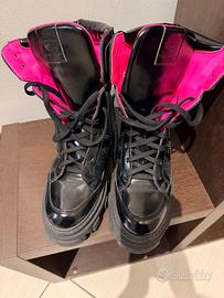 Vendo splendidi scarponcini Chiara Ferragni originali, modello platform con suola chunky super di tendenza. Colore nero lucido con interno fucsia acceso e iconico logo occhio laterale. Un modello molto particolare e difficile da trovare, perfetto per look grintosi e street. Le scarpe sono in ottime condizioni, usate pochissimo (come da foto). Numero 38, calzata regolare. Dettagli: * Marca: Chiara Ferragni * Modello: CF3039 * Numero: 38 * Materiale: vegan leather * Colore: nero con interno fucsia * Suola platform alta e comoda Prezzo: €95 Ottimo affare: pagate molto di più in negozio! Prezzo leggermente trattabile per vendita veloce.