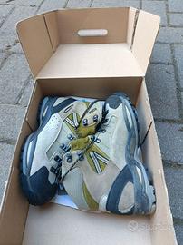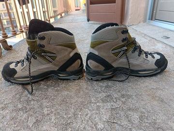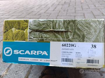 Scarpe da trekking in montagna in goretex con rivestimenti in scamosciato e cordura di marca Scarpa (marca tecnica nota nell'abbigliamento da montagna) taglia 38, dunque ideali per ragazzo/a o adulto dal piede molto piccolo. Venduti nella scatola originale, in ottime condizioni perchè usati davvero poco dai miei figli come constatabile dalle foto (vedi anche condizioni della suola). Sono visionabili e calzabili per prova in Cuneo dopo contatto per messaggio