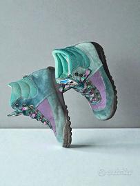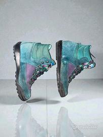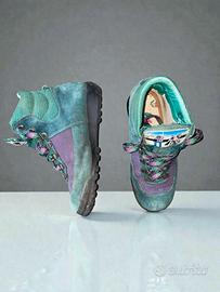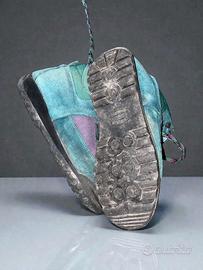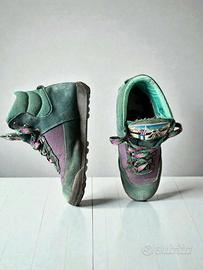 Scarponcini da trekking/montagna vintage in camoscio e tela. Stile color block anni '90: verde petrolio e viola. Design high-top robusto con lacci a contrasto. Perfetti per un look retro da montagna. EU:35 /36 CM : 22 UK: 3 US (Donna): 5
