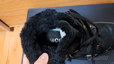 Scarponcini da donna invernali neri, imbottiti e con peluche sulla cavigliera, impermeabili, eleganti. Ideali per la stagione fredda. Effetto leggermente brillantinato con soli lacci per la chiusura.