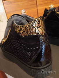 Scarponcini neri pelle lucida e camoscio NG NeroGiardini n.38, decori dorati, stringate ma con comoda zip laterale. Comodissime, leggere. Nuove come uscite dal negozio, indossate solo il tempo di capire che avevo sbagliato numero ma tardi per cambiarle,. Con la propria scatola.