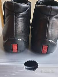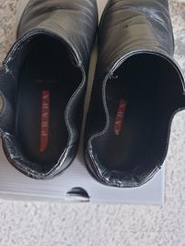 Scarponcini Prada usati ma in ottimo stato. Morbissima nappa nera, plantare Prada comodo e confortevole. Scatola originale, nuova. Due piccoli graffi nella calzatura destra (vedi foto). Suola, laterali e tacchi perfetti.