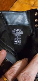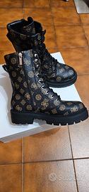 Stivaletti tg. 36, nuovi, colore marrone con disegni color oro, cerniera laterale e lacci frontali. Scatola originale. Mai usati, né indossati né provati. Nuovi di negozio. Tomaia sintetica esterna, pelle all'interno inclusa la soletta e suola in gomma. Lettera "G" applicata sul retro degli stivaletti. MISURE: Lunghezza suola, 25.5 cm. Larghezza pianta piede, 10 cm. Larghezza tallone, 7 cm. Tacco alto 4 cm. Suola alta 2.5 cm. Altezza totale scarponcini, 22 cm.