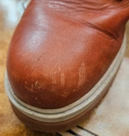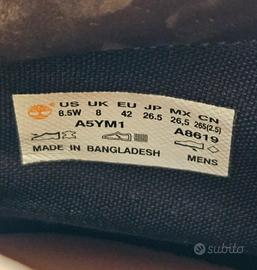 Vendo classici stivaletti Timberland da uomo, taglia 42 EU (8.5W US). Modello in pelle waterproof per l'inverno o le mezze stagioni. La scarpa è usata e presenta dei fisiologici segni di usura sulla punta e pieghe sulla pelle che le conferiscono il tipico fascino "vissuto", ma la struttura, le cuciture e la suola a carrarmato sono ancora solide.