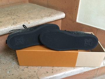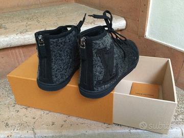 Scarponcino donna Louis Vuitton originale acquistato in boutique, Tg. 38 in lana e paillettes, colore grigio e nero, con lacci, ceniera sul retro e logo laterale della maison. Suola in gomma nera con logo LV. In perfetto stato usate pochissimo, come nuove.