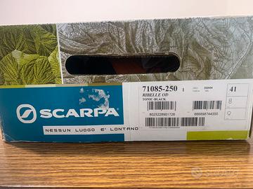 Nuovi con scatola, mai usati con etichetta originale. Acquistato numero errato. Semi ramponabili, idrorepellenti. Pianta larga adatti per un nr. 40 di piede. Ribelle OD di Scarpa, lo scarpone leggero per alpinismo, vie ferrate e backhicking impegnativi anche con carichi pesanti. La tomaia in pelle scamosciata idrorepellente 2,5mm, gli inserti in microfibra idrorepellente e il collarino in tessuto elastico aumentano il comfort. Il sistema Sock-fit XT avvolge il piede come una calza, il bordo di protezione in PU nella parte esterna assicura maggiore leggerezza, mentre la gomma nella parte interna e in punta aumenta la protezione. La fodera in tessuto 37,5 laminata dispone di tecnologia Outdry che permette impermeabilità e comfort. sottopiede di montaggio Activ Plus garantisce massimo comfort, stabilità e un controllo ottimale in torsione suola Precision Tech Roll sviluppata in collaborazione con Vibram battistrada in mescola Mont di Vibram che assicura stabilità e durata compatibile con ramponi semi-automatici active system (sistema di costruzione zona tallone, collo del piede e avampiede per comfort assoluto) dynamic tech roll, sistema innovativo di costruzione della tomaia con la suola per ottenere una calzata ergonomica e massima sinergia di prestazione tecnologia 37.5 che aiuta a mantenere la temperatura ideale di 37.5 gradi Outdry crea una barriera traspirante e idrorepellente
