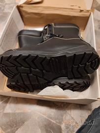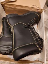 Stivale mod. "C", con tomaia in pelle fiore idrorepellente ed ignifuga di colore nero + reflex giallo. Fodera in membrana impermeabile e traspirante. Puntale in acciaio o in Composit® e soletta antiperforazione tessile in Kevlar. Chiusura mediante lacci ignifughi passanti in occhielli e dispositivo di sfilamento rapido a cerniera. Suola in gomma antiolio, antistatica e antiscivolo. Lavorazione "Ago".