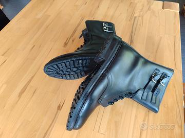 Anfibio militare originale anni 80’ “Calzaturieri MASTROMARCO”, con fodera in pelle nera e con suola in gomma carrarmato lavorazione Pirelli . Allacciatura con lacci e fibbie, tutte le componenti sono originali. Nonostante gli anni sono in perfette condizioni in quanto usati pochissimo e di ottima qualità manufatturiera. nr. 47