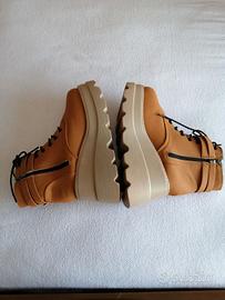 Questi scarponi da donna indossano una numero 39/40, completamente anfibi altezza posteriore circa 10 cm punta 4/5 cm , comodi ideali per escursioni in montagna, e anche sulla neve, da portare anche in città come moda casual , fibbie laterali regolabili , interamente scamosciati , sono nuovissimi e mai usati mai usati .