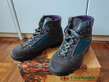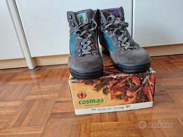Scarponi vintage anni 1981-82 taglia 39, usati ma in ottime condizioni. Il marchio COSMAS nasce nel 1971 come ditta artigianale di Montebelluna (TV). L'attività del calzaturificio si impronta sulla ricerca e la realizzazione di prodotti altamente qualificati e tecnologicamente evoluti. Si è affermato nella produzione di scarpe da montagna e outdoor per evolversi negli anni 90 nella produzione di calzature militari e professionali.