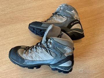 Scarponi da montagna con Goretex, marca SCARPA, colore grigio/nero, numero 42 calzata stretta, suola VIBRAM, in condizioni accettabili.
