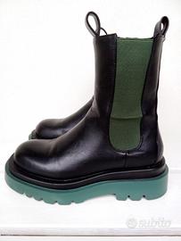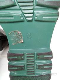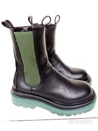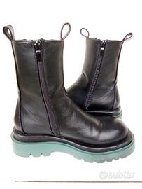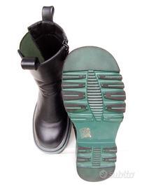 Scarponi donna numero 36 pianta larga, in similpelle con cerniera interno gamba e fasce elastiche verdi laterali. Suola in gomma verde.Usati pochissimo.