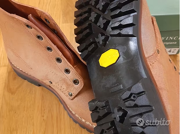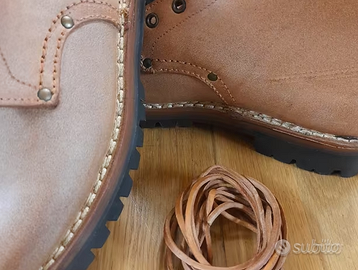 Vendesi scarponi da montagna L.R. Vinci Rugiati in vero cuoio con suola in robusta gomma tutto carro armato Vibram, oppure anteriore liscia (che non accumula fango) + tacco carro armato. Ho poche misure rimaste (42,43,45 tutto carro armato sono terminati, 43 tacco armato e suola liscia terminati). Gli scarponcini sono nuovi con scatola. Gli scarponi sono in cuoio di pelle vacchetta. Vengono venduti con una mano di grasso di foca. Sono rigidi e si ammorbidiscono nel tempo usandoli ed ingrassandoli. Calzano comodo/abbondante... la calzata è considerata indossandoli con delle calze grosse. La loro durata è eccezionale, sono indistruttibili. Sono scarponi preferiti dai pastori che li indossano tutti i giorni in campagna. Contattatemi per altre foto, taglie e scelta della suola. Valore 120 euro. Svendo per stock trovato in magazzino di mio suocero. Di seguito, un estratto tratto dal sito del calzaturificio Rugiati. Lavorazione Goodyear: per la sua realizzazione viene utilizzata una lunga e delicata lavorazione di origine inglese, garanzia di eccezionale qualità: il metodo Goodyear. Nella lavorazione Goodyear il guardolo, una striscia di cuoio morbido, viene cucito al labbro dell'increna del sottopiede di cuoio, fissando insieme anche la tomaia e la fodera. Poi viene applicata e cucita la suola. Nell'intercapedine tra sottopiede e suola è collocata un'intersuola riempitiva. Il risultato finale, semplicemente perfetto, premia la grande abilità e l'estrema precisione necessari in questa tecnica di lavorazione e ne fanno una delle più pregiate in circolazione.