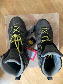 Scarpone con tomaia in pelle scamosciata idrorepellente, bordo protettivo PU Pro Tech e fodera impermeabile in Gore-Tex.