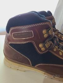 Scarponi da trekking da uomo Timberland Euro Hiker A11UA in pelle marrone chiaro e blu navy con lacci. Solo da lucidare.