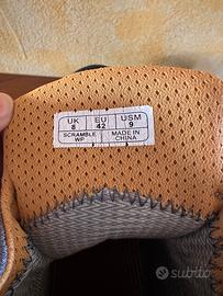 Scarponi trekking Dolomite Scramble WP NR 42 progettate per l'escursionismo e la montagna, caratterizzate da una tomaia in pelle scamosciata e una struttura robusta per offrire supporto e protezione sui terreni tecnici. Caratteristiche principali Marca: Dolomite. Modello: Scramble WP nr. 42 Utilizzo: Escursionismo, trekking e attività outdoor in montagna. Design: Presentano un collo alto per la protezione della caviglia, una punta rinforzata in gomma per resistere agli urti e passanti per lacci in metallo resistenti. Praticamente nuove. Indossati ma mai utilizzati per escursioni. No scatola.