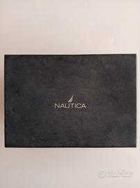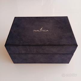 Vendo scatola box porta orologi a marchio Nautica, caratterizzato da un interno in materiale scamosciato beige e un divisorio centrale per ospitare due orologi o un orologio e un set di cinturini di ricambio. In perfette condizioni!