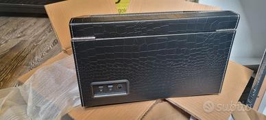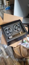 bellissima scatola carica orologi automatici, rivestita in pelle nera, quattro postazioni di ricarica, sei postazioni a riposo, totale dieci postazioni. elegante. Nuova.