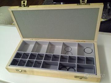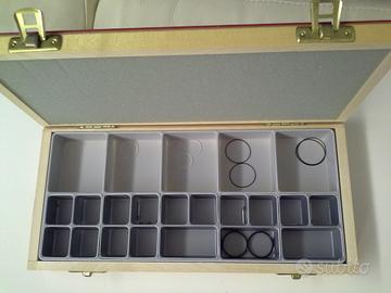 Struttura in legno, coperchio superiore rivestito in similpelle rossa con logo Cartier, interno a scomparti con presenti alcuni ricambi per gli orologi della serie Must 21 (guarnizioni per fondelli, micro viti, perni per bracciali e cinturini).