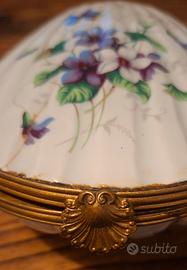 scatola a forma di conchiglia, dipinta a mano con soggetto floreale. Limoges, France. Danneggiata in varie parti.