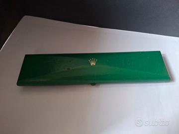 Scatola orologio Rolex vintage. Originale. Configurazione allungata rettangolare con coperchio a scatto. Rivestimento colore verde con impresso logo con corona oro. Periodo fine anni '50 e anni '70. Interno: base con velluto verde scuro e coperchio in raso oro e logo Rolex in verde. Cm 22,5 x 5,5 spessore al centro 2,8 circa.