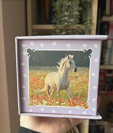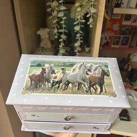 Bellissima scatola porta gioielli con due cassetti, perfetta per riporre i vostri oggetti preziosi. E' decorata con immagini di cavalli e dettagli a forma di cuore.