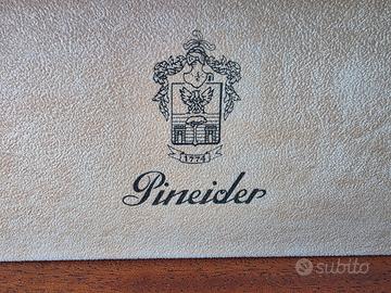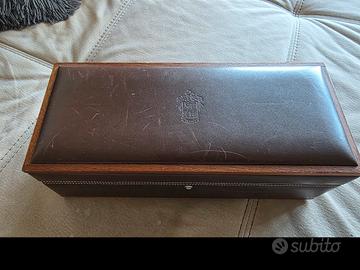 Vengo splendida e prestigiosa scatola porta orologi firmata Pineider 1774, storico marchio fiorentino sinonimo di eccellenza e artigianato italiano. L'oggetto è un vero pezzo da collezione, realizzato con materiali di altissima qualità: Esterno: Struttura in pregiato legno con inserti in vera pelle marrone scuro e cuciture a contrasto realizzate a mano. Interno: Rivestimento in morbido velluto/alcantara color sabbia per proteggere gli orologi da graffi e polvere. Capacità: 4 scomparti con cuscinetti estraibili, adatti anche a orologi di grandi dimensioni. Dettagli: Logo Pineider impresso a caldo sia sulla pelle esterna che all'interno del coperchio. Cerniere e finiture in metallo cromato di alta robustezza. Condizioni: L'oggetto è usato ma in buone condizioni generali. La pelle presenta alcuni segni superficiali del tempo (visibili in foto) che donano un fascino "vissuto" e autentico al pezzo. Interni perfettamente puliti e integri. Un complemento d'arredo elegante per la scrivania o il comò, ideale per chi vuole custodire i propri segnatempo con stile.