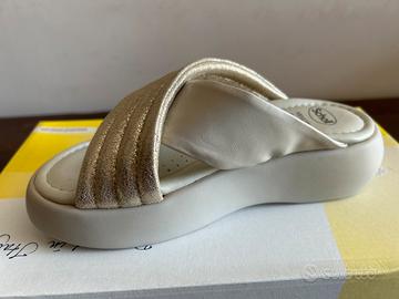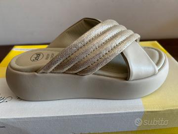 Sandalo in pelle laminata+pelle. Colore:platino Plantare:memory cushion Altezza:45 mm