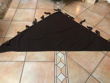 Elegante scialle vintage in lana nera decorato con 15 code di visone originali. La lavorazione è di alta qualità e il pelo si presenta morbido, lucente e ben conservato. La lunghezza importante di 2 metri e 10 permette di indossarlo in diversi modi: avvolto sulle spalle, come stola, oppure come accessorio elegante per outfit serali o shooting fotografici.