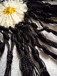 Grande Scialle quadrato, realizzato all'uncinetto, con margherite in lana, su rete nera di filato lucido (seta?).