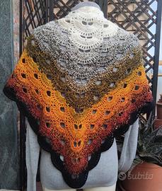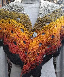 Questo scialle triangolare lavorato a uncinetto è un capo molto versatile perchè può essere usato anche come sciarpone, sopra ad una giacca o cappotto o semplicemente come coprispalle caldo e avvolgente. La vera particolarità di questo filato leggero caldo e soffice in misto lana è sicuramente il colore.